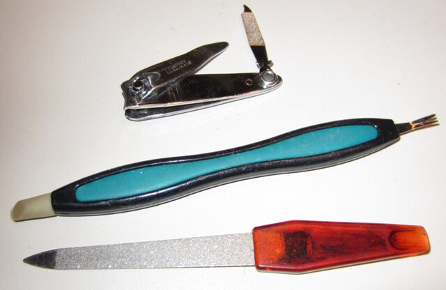 Hierna vijl ik de randen van m'n nagels gelijk met een plat vijltje (onder op de foto). Daarna zijn de nagelriemen aan de beurt. Met een bokkepootje (midden op de foto) duw ik de nagelriem wat achteruit en verwijder ik eventuele velletjes met het metalen gedeelte.