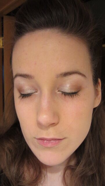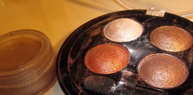 Op mijn ogen gebruik ik oogschaduw van het merk Max (te koop in Action). Het is prachtige 'baked' oogschaduw die je zowel droog als met wat water op je penseel kan gebruiken. Maar voor de iets lichtere look gebruik ik deze gewoon droog. Een beetje van het glinsterende wit en bronzen kleurtjes fleuren de ogen wat op. Alvorens de oogschaduw aan te brengen, gebruik ik een creme oogschaduw zodat alles goed blijft zitten.