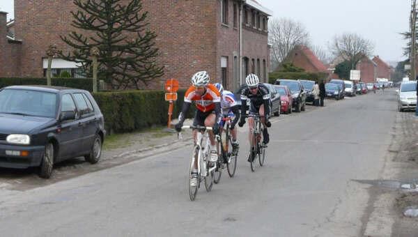 wedstrijd gedaan te oosteeklo, vanmorgen al 76 km gereden en in de koers met drie vertrokken al in de tweede ronde .