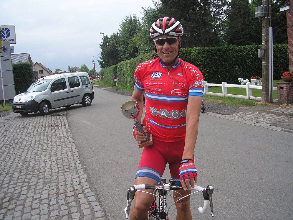 Thuiswedstrijd te astene-deinze mooie organisatie en mooie omloop en de renners hadden er weer van in de start zin in. Ik koos een ronde of twee te wachten van eens een demmarage te plaatsen zo ik weer maar weinig gefietst had deze week, dan de derde ronde er toch eens een snok aan gegeven en direct kwam er een breuk en gingen we er met zestien man vandoor, na een ronde of twee zag ik dat het niet goed draaide en dan maar besloten er nog eens een snok aan te geven en direct kreeg ik een sterk rijdende wouter delange mee. Lang met twee konden we het niet houden want direct was de mobius train opkomst met schoonzoon steven martens en pieter demeyer,bart verhasselt en plaatselijke renner tom joris ( filo-team ). Dat was meteen de goeie vlucht, wel nog pech voor wouter delange de renner uit vinkt slipte weg in een bocht en ging onderuit gelukkig zonder erg. Dan op twee ronden van het einde een sprong gedaan en meteen kwam steven mee met mij en weg waren we, steven werd blijkbaar uitgespeelt door zijn team en gaf ook een goeie indruk zo behaalde hij zijn vierde zege van het seizoen en ik mijn vijftiende bij de B's .