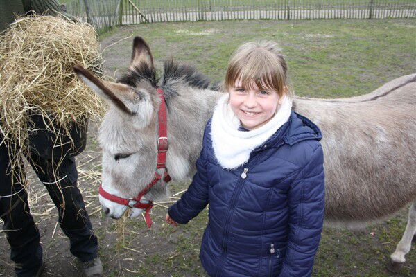 De tocht begon bij de varkens, daarna gingen we naar de pony's, de koeien en de paarden en tenslotte kregen de ezels eten. Hier maakte 'ons' Noortje dan ook voor de eerste keer kennis met de ezel Noortje.