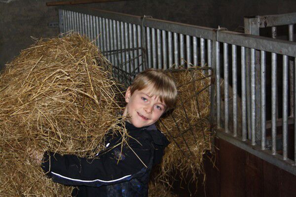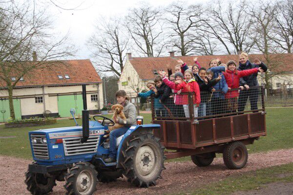 Groep 1 ging de dieren verzorgen: We moesten de stallen van de pony's uitmesten, we mochten meerijden met de tractor, we kamden de varkens en de cavia's.