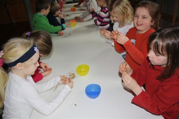 Omdat 'het paard een beetje ziek is' kon de huifkartocht niet doorgaan en leerde groep 1 iets bij over de kip en het ei. Ze weten nu hoe lang een kip moet broeden, waar de witte en de bruine eitjes vandaan komen, dat kippen een tong hebben en dat hun ogen van onder naar boven dicht gaan!