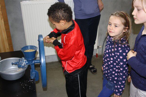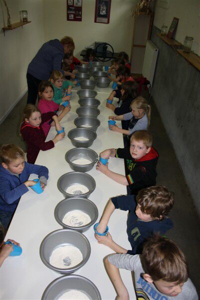Om 10u startten de activiteiten dan. Groep 1 mocht deze voormiddag broodjes bakken. Ze leerden hoe meel gemaakt wordt, hoe je verschillende soorten bloem krijgt, hoe ze deeg moeten kneden, ...