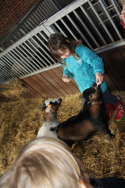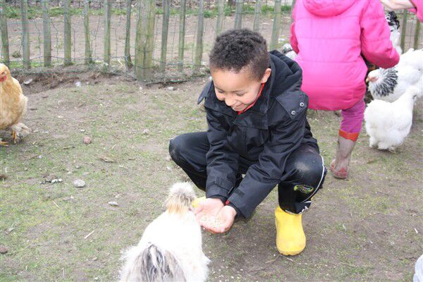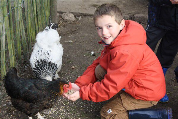 Groep 2 mocht na het ontbijt alweer mee om de dieren te voederen. Dit keer waren het wel de kleine beestjes: de kippen, de schapen, de geiten, de konijnen en de cavia's.