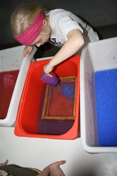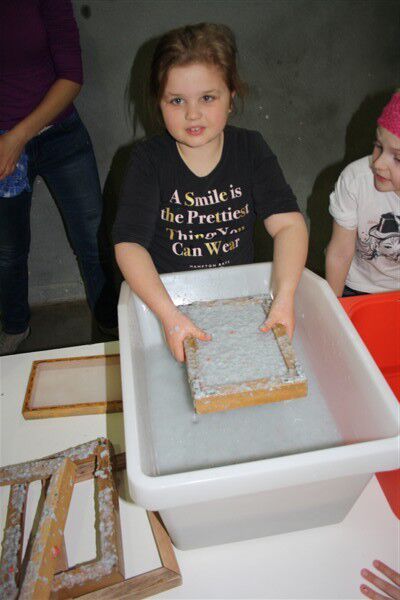 Groep 2 mocht zelf papier scheppen. Heel leuk! Wel jammer dat die papiertjes moesten gescheurd worden... Dat was iets minder leuk...