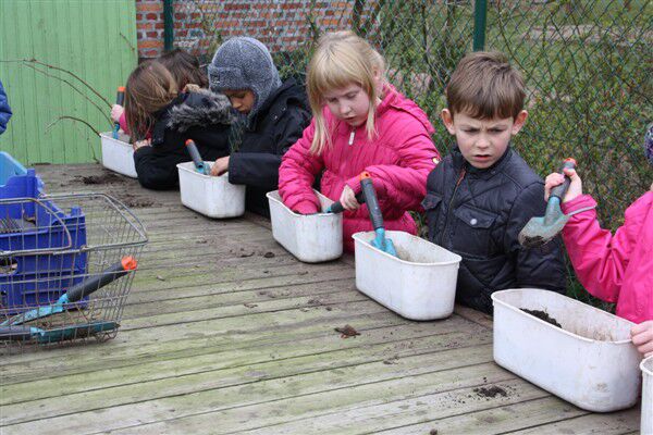 We zaaiden peultjes in een potje. Hiervoor mochten we onze eigen aarde gaan scheppen. Handen vuil maken mocht hie natuurlijk!