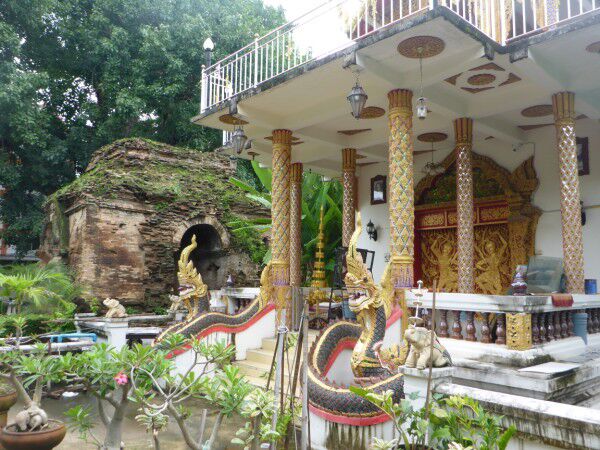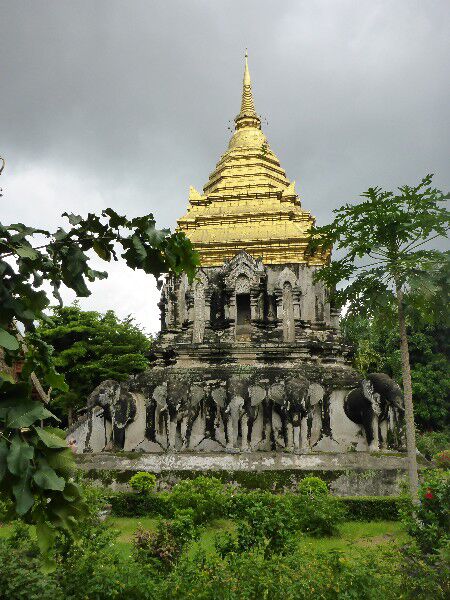 We worden wakker en...het regent dat het giet!!! Dan maar ook het gemakske ontbijten. Probleem is alleen dat het volledige ontbijtbuffet reeds geplunderd was en het wordt maar zeer traag aangevuld. Uiteindelijk kunnen we toch nog alles bemachtigen wat we nodig hebben dus we kunnen er tegen. Vandaag is een rustdag. Deze morgen wat op het terras en aan het zwembad ( onder het afdak) vertoefd. Tegen de middag stopt het stilaan met regenen dus tijd om een wandelingeske door de oude stad. Clo en Louke blijven aan het zwembad en wij verkennen het deel dat we gisteren niet gedaan hebben. We komen weer enkele mooie tempels tegen, het is hier een en al tempel wat de klok slaat. Terug in het hotel nog wat gezwommen en ons dagelijks ritueel...aperitief. Tegen half zeven charteren we een tuktuk om ons naar de nightmarket te brengen. Met 4 in 1 tuktuk,, de Jl mag van voor zitten.We doen gouden zaakjes op de night market en laten ons goe gaan Toch wel plezant dat afpingelen. Ergens midden in de nightbazaar eten we in een vrij groot visrestaurant en het wordt afgezaagd maar ook hier eten we weer heerlijk! We nemen een tuktuk terug en moeten nu al onze aankopen in onze valies krijgen want morgenmiddag nemen we het vliegtuig naar het zuiden.