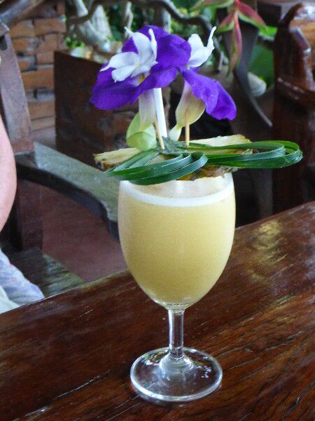Na onze toch worden we samen met de kayaks in een truck geladen, de peddelaars worden thuis afgezet en wij gaan terug naar het hotel. Opfrissen, ons goed insmeren met 95% deed, onze tropenkleren aan en op naar de bar. We hebben een heerlijke cocktail verdiend, ook deze prachtig versierd, met bloemen uit de tuin.