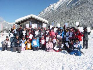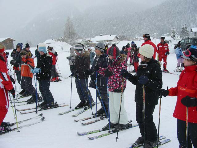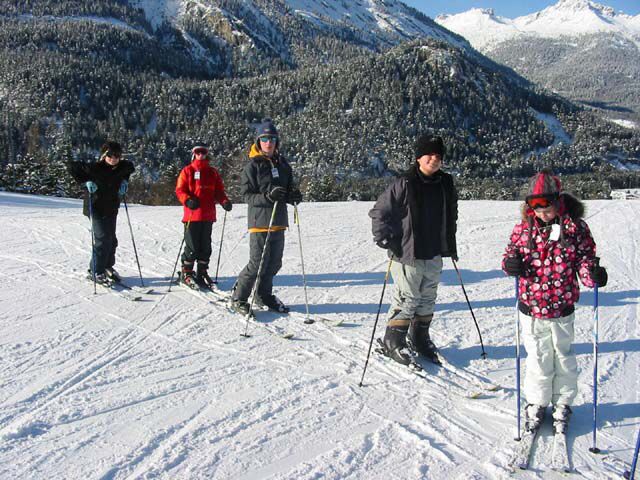 de week voor de paas vakantie zijn we op sneeuwschool geweest. ik zit aan tafel in het midden, davina rechts. op de ski piste heb ik een rode jas en grijze muts aan