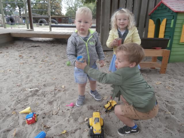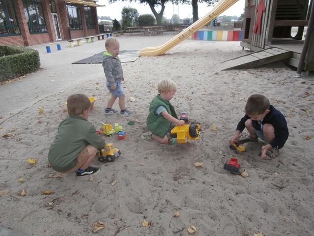 Onze zandbak hebben we gevuld met kastanjes. Iedere speeltijd wordt er door groot en klein ijverig gezocht naar gevallen kastanjes op de speelplaats.