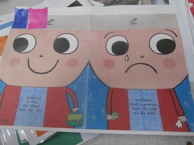 We hebben een kringgesprekje rond blij, boos en verdrietig gehouden. De juf had prentjes bij, de kleuters 'lazen' en omschreven de prenten. Hierna legden we iedere prent bij het juiste gevoel.
