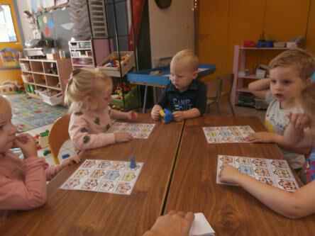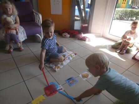 woordenschatlesje: één kleuter zegt een woord dat de andere twee kleuters zo snel mogelijk moeten aantikken.