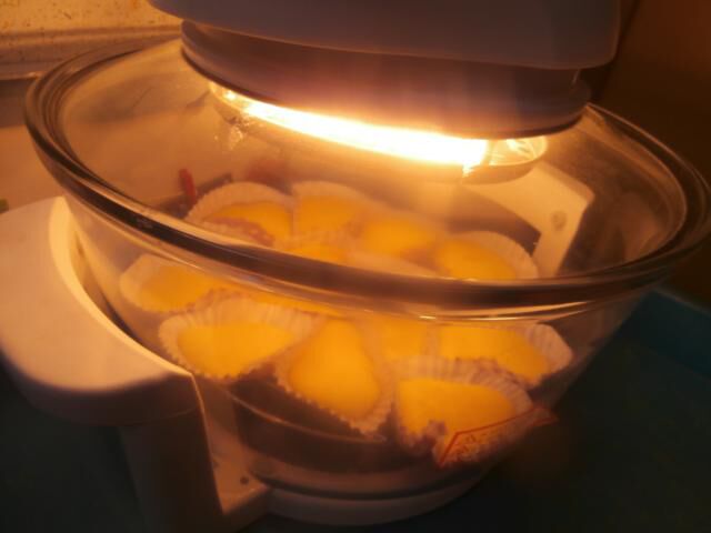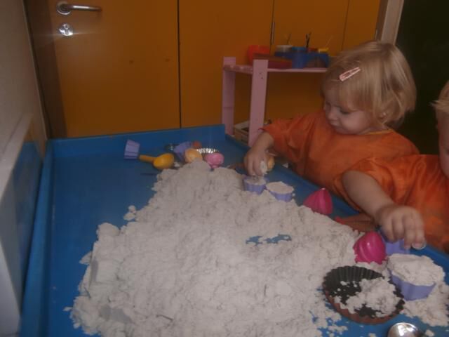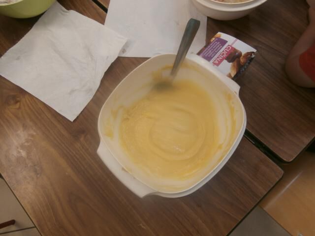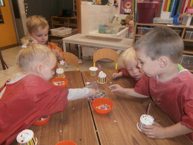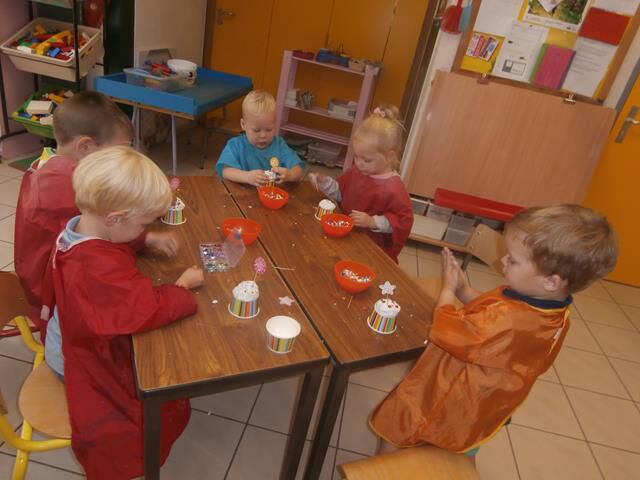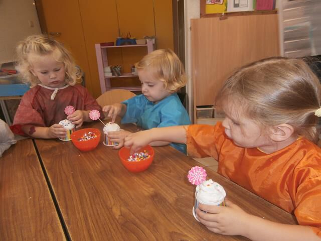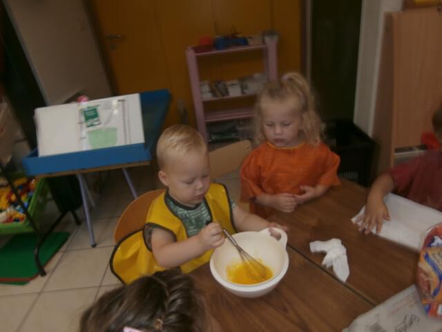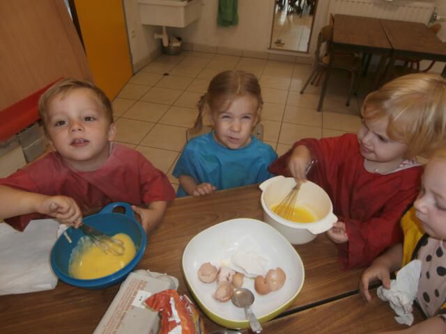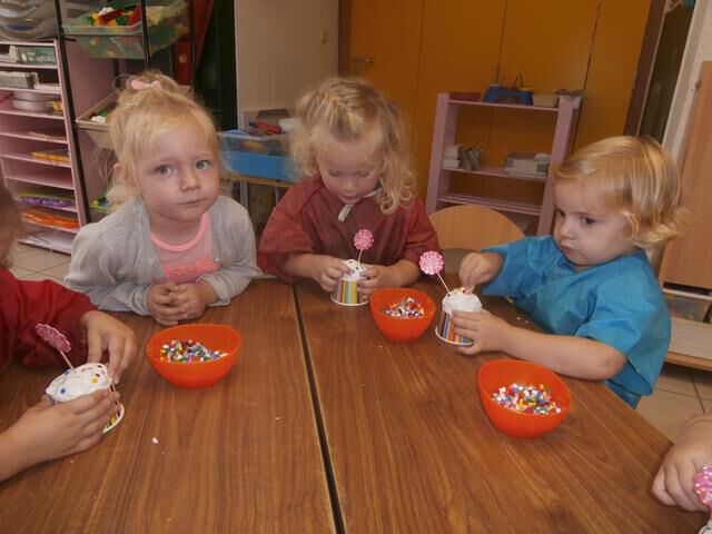 verjaardagscakejes bakken: eitjes breken, suiker, bloem en boter toevoegen. Heel goed roeren en bakken maar.