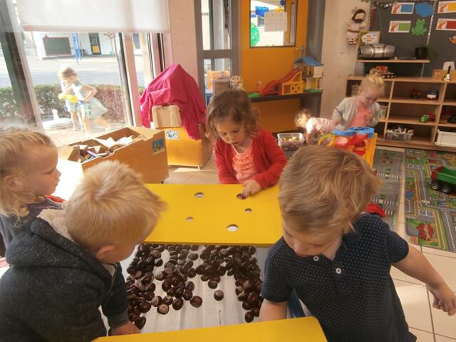 Onze zandbak hebben we gevuld met kastanjes. Iedere speeltijd wordt er door groot en klein ijverig gezocht naar gevallen kastanjes op de speelplaats.