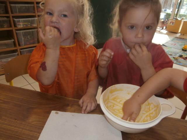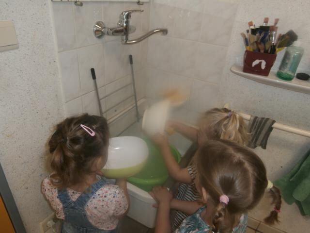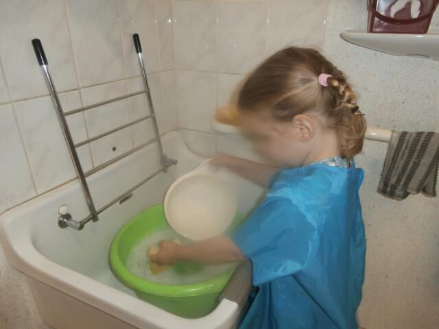Wat natuurlijk net zo leuk is als bakken, is het uitlekken van de kommen en afwassen.