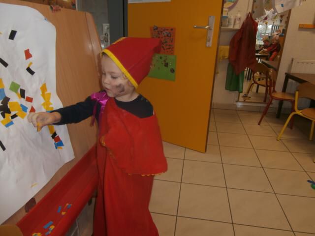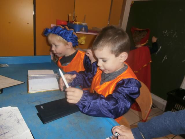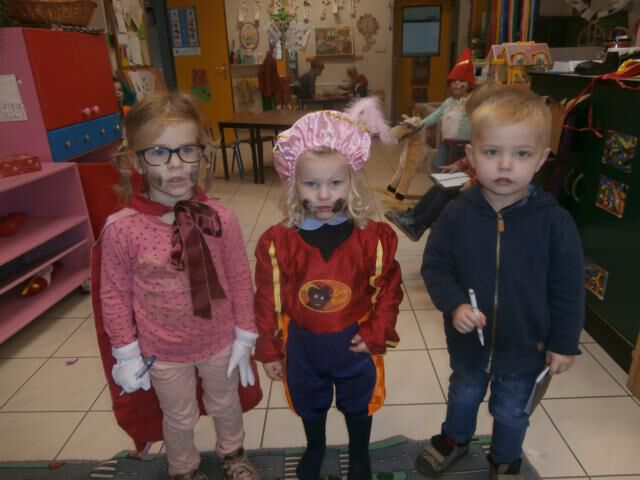Sinterklaas en zwarte piet in onze klas:  sint Lou schrijft onze bestellingen in haar dik boek. De pieten bezorgen oefencadeautjes en proeven van hun chocola.