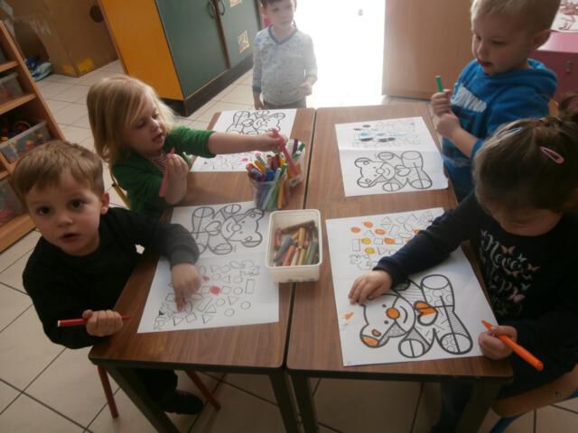 Kijken naar de foto's en de juiste kleur gebruiken voor de voertuigen.