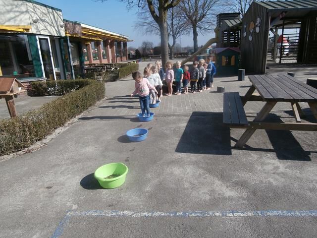 We lopen, gelijk in het verhaal, door het gras, de rivier, de modder, het bos, …… (in een voelparcours in onze klas)