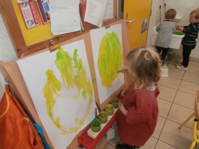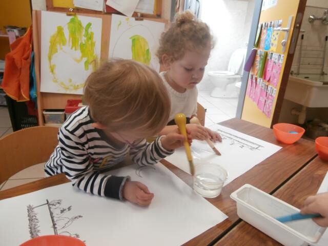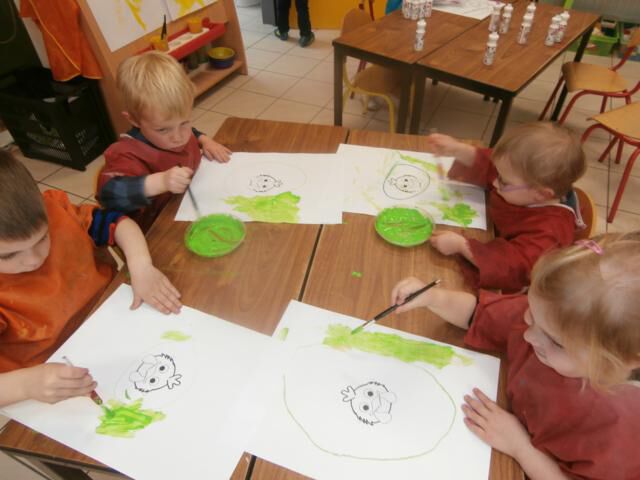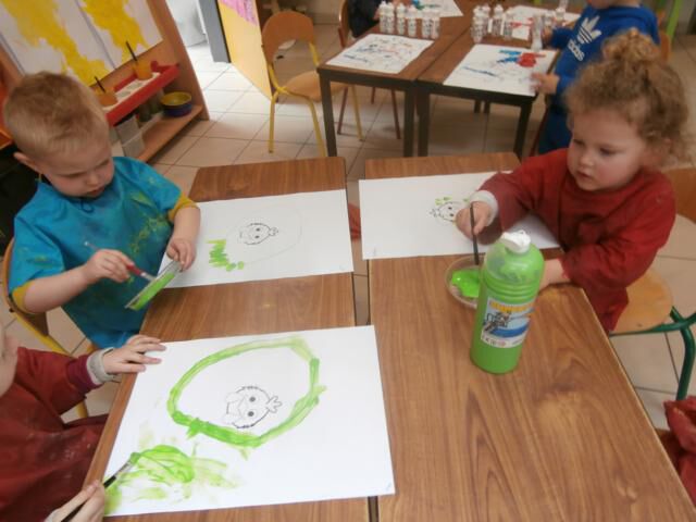 De kip in het gras: we moeten een cirkel rond de kip tekenen en mogen alleen buiten de cirkel schilderen. Goed opletten.