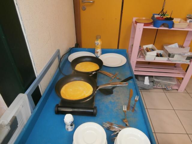 eitjes breken, kloppen met de garde, bakken in de pan en lekker opsmullen.