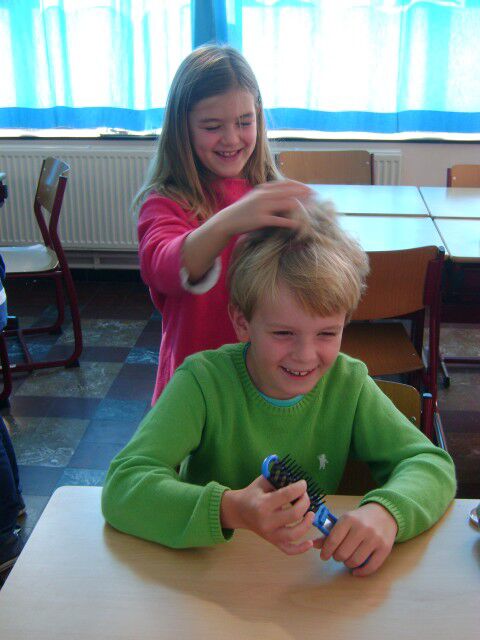 Gisteren hadden we een leuke luisterles. Ons taalthema gaat over haar, dus ook de luisteroefeningen. De kinderen moesten goed luisteren en alle opdrachten zo goed mogelijk uitvoeren. Zo eindigde iedereen met een grappig kapsel. juf Helena