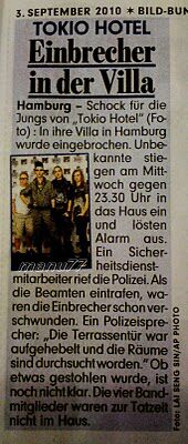De jongens van Tokio Hotel zijn het slachtoffer geworden van inbraak. Onbekenden braken gisteren nacht in via de terrasdeur van het huis van de band in Seevetal, nabij Hamburg.Ze plunderden het huis van de band met frontman Bill Kaulitz, die op die avond zijn 21ste verjaardag vierde. Wanneer het alarm om 23.30 uur afging , treft de politie korte tijd later geen dader aan. Van de daders is er geen teken. Wat ze hebben gestolen is onduidelijk. De band zelf was niet thuis op het moment van de inbraak,zei Tokio-Hotel-producer en manager David Jost. Ze hebben waarschijnlijk niets vermoedend hun verjaardag gevierd...