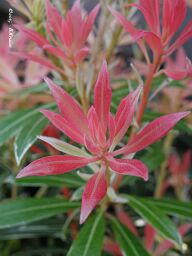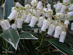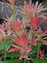 De nieuwe uitlopers van de Pieris japonica "Flaming Silver", zijn rood-,oranje- en geelachtig van kleur. Daarnaast hebben ze ook nog prachtige bloemtrossen. Het woord pieris is afgeleid van pieriden, Griekse muzen.