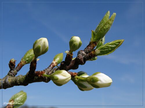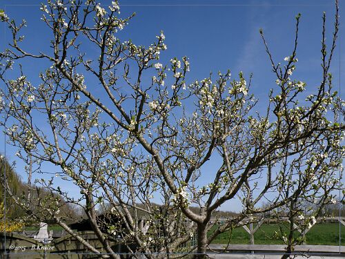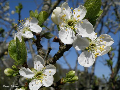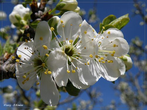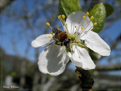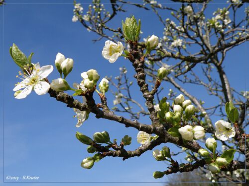 De pruimenboom staat dit jaar, in volle bloei. Maar zoals wel vaker, veel bloei, weinig vrucht. Dit werd veroorzaakt door late nachtvorst of hevige regenbuien met windstoten, die de bloesems beschadigden. Anders kan, het dit jaar, een goed pruimen jaar worden. Hieronder enkele opnames van de bloei en één met een bij, voor de bestuiving.
