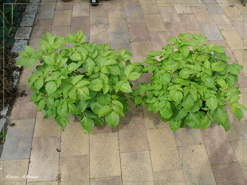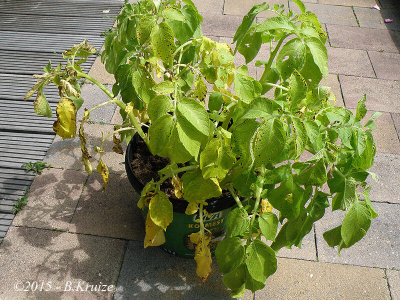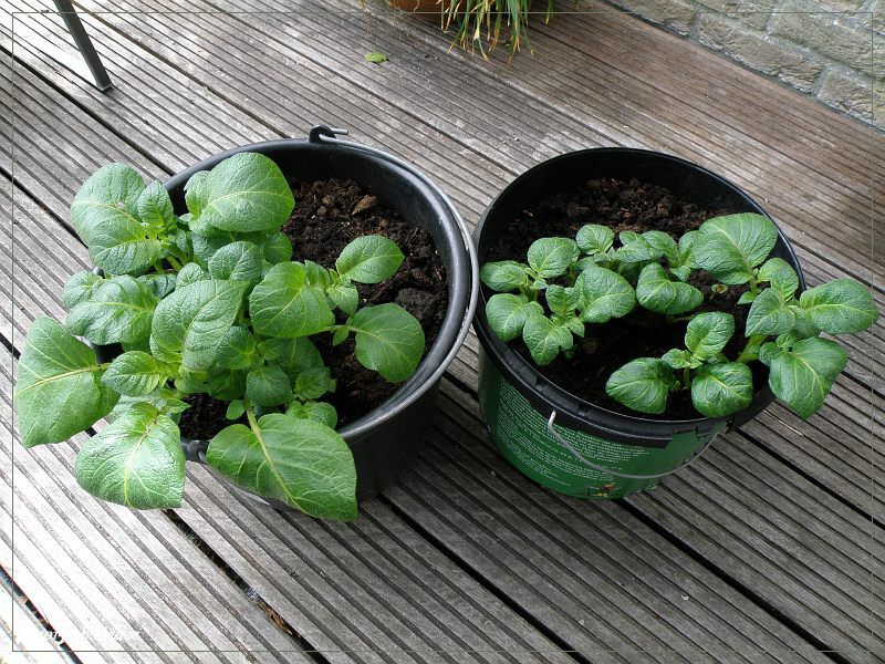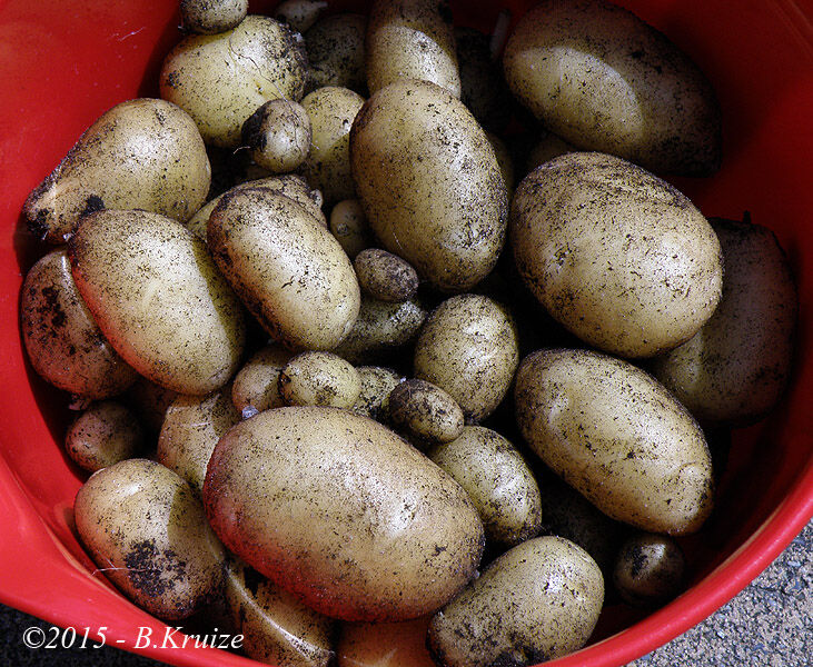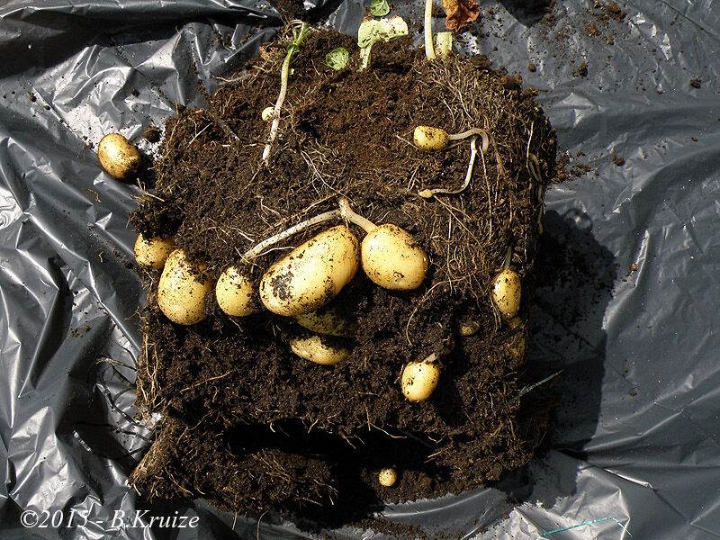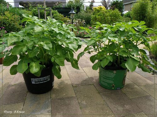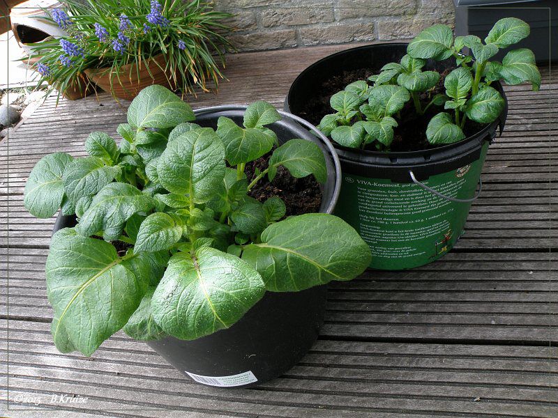 Dit jaar, voor het eerst, eens proberen om aardappels in een emmer te kweken. De informatie, dat iemand al jaren aardappels kweekt in opgestapelde autobanden, deed mijn nieuwsgierigheid wekken. Op internet aan het zoeken geweest en vond diverse manieren om aardappels te kweken. Zoals in emmers, draagmanden etc. Het is ideaal voor mensen die een te kleine of geheel geen tuin hebben. Zo zou je zelfs op een balkon, wat eigen aardappels kunnen kweken. - in de emmer ontwatering gaten boren - 5 cm aarde of potgrond in de emmer - plaats 4 aardappels, verdeeld, op de bodem. Iets van de kant af. - 5 cm aarde of potgrond over de aardappels - maak de aarde of potgrond nat - als de uitlopers van de aardappels iets boven komen, dan weer 5 cm aarde of potgrond erop doen - dit herhalen, tot 2 cm onder de rand van de emmer - de aarde of potgrond nat maken Tijdens de groei regelmatig water geven, anders zal de oogst mislukken !! Na een paar maanden, zal het loof afsterven en zijn de aardappels gereed om te worden geoogst