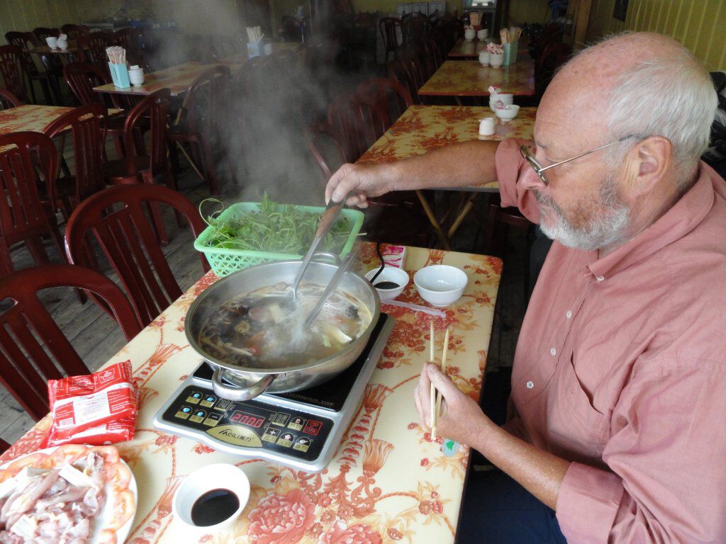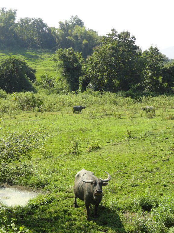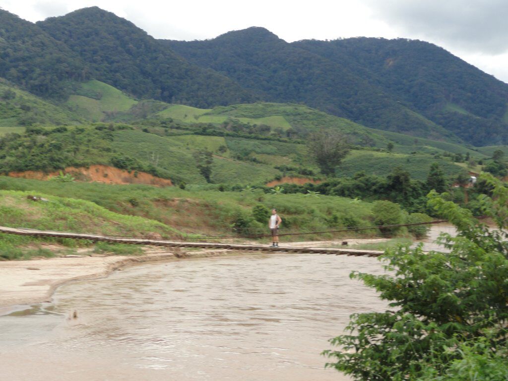 Sapa was prachtig, een mooie afsluiter van Vietnam. En een mooie voorbode voor wat nog komen moet: Laos. En daar hebben we zin in. Om een lang verhaal van 3 dagen onderweg zijn samen te vatten: we nemen een bus, een nachttrein, bestellen 's morgens een visum in de ambassade van Laos in Hanoi, ik eet nog een portie pho (vietnamese noodle soep dat je niet uitspreekt als pho zoals wij dat doen, maar eerder als feuh: hetgeen klinkt als een quasi geruisloze scheet, je kent die wel: the worst of it's kind, hetgeen ook een voorbode is op zich eigenlijk, later meer daarover), Guy slaat deze portie pho over, want hij heeft gemerkt dat een portie pho zeer consequent een ander euvel met zich meezeult in diens slipstream, ook later hierover meer, je kan je klok erop afstellen: na een portie pho volgt een andere portie die veel gelijkenissen vertoont met een portie pho. Ik doe wat jongere mannen doen met oudere mannen hun advies: vertikaal klasseren. Het is niet het enigste dat ik vertikaal klasseer die dag, later meer daarover. Maar waar zat ik? Oh, ja, we gaan ons visum ophalen, dat is reeds een paar uur later klaar, en nemen een bus die ons afzet op de snelweg, waar we opgepikt worden door de internationale nacht bus. We zullen met deze bus de grens over schrijden en door rijden tot Vientiane, de hoofdstad. We eten meer dan 24 uur niets, wat mij ook ergens weer doet denken aan pho. Maar daar had ik het al over gehad dacht ik.