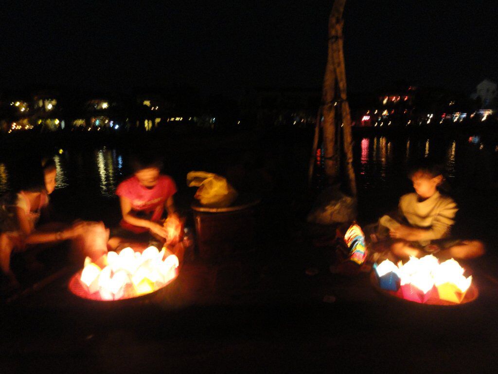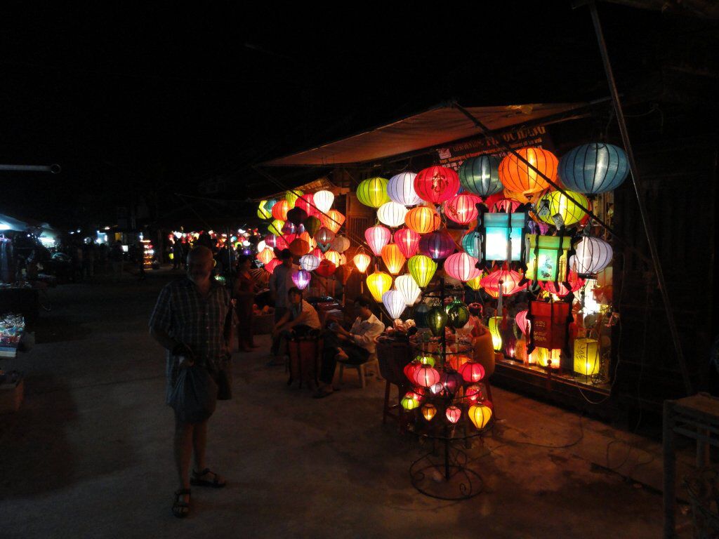 Maar er is een reden voor dit feestmaal. We zijn de laatste drie dagen in Hoi An. En iedereen die in Hoi An is geweest weet dat in Hoi An alles draait rond 1 ding: genieten. Hier vind je lokale delicatessen als cau lao en white rose en talloze gebakjes in de markt, heerlijke fruit sappen en shakes aan de kade terwijl de veerboten elkaar aflossen, rustige koloniale straatjes met Mozart door de speakers ipv tuuterende of sputterende camions, kunst en kleren winkels waar de vrouwen in sierlijke gewaden ons op een zacht meerminnige maar doelgerichte toon proberen binnen te lokken: hello, how are you, where are you from, what is your name, you are very handsome, buy something. Paf. Na drie dagen beginnen we al wat minder te blozen en hebben we onderhand wel door dat het heel vriendelijke lieve mensen zijn, maar toch met een kapitalistische fundering.