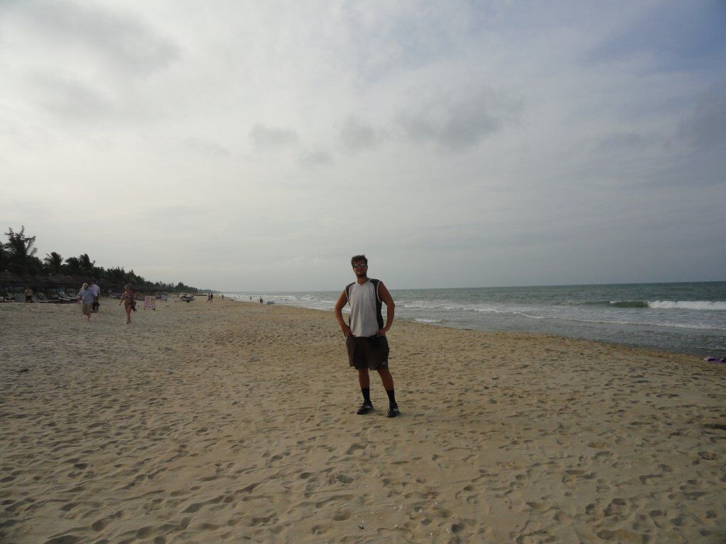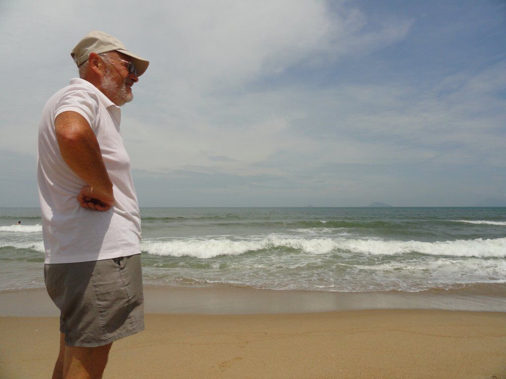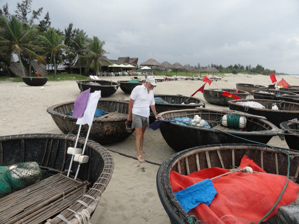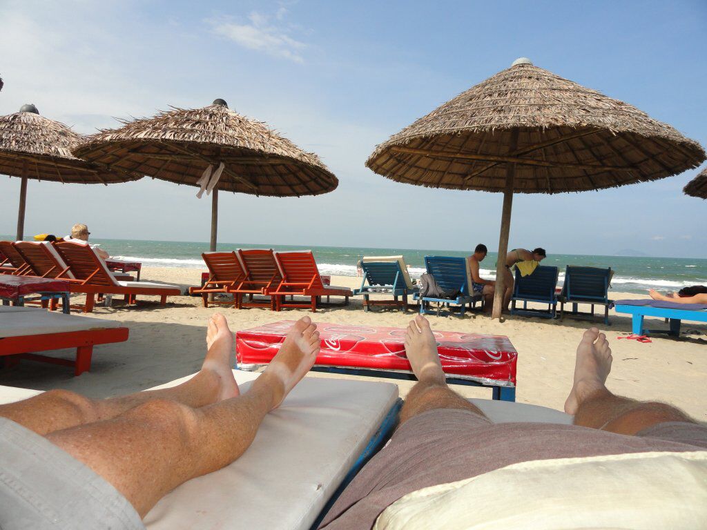 Vandaag kwamen we toe aan de kust en hebben we uren naar het water gekeken. Hoi An. Drie jaar geleden was ik hier ook. Ook toen heel mooie herinneringen van heel mooie mensen opgenomen. Daarstraks nog een oude banden hersteller gezien. We moesten er stoppen voor Guy zijn achterband. Ik herkende hem direct van toen hij me een uur in het Frans toesprak -waar hij zeer trots op was- nadat hij jaren geleden ons brommertje had hersteld. Ik blijf wat op de achtergrond en Guy doet dezelfde ontdekking als ik toen dat deze man goed Frans kan spreken. Dat was echt mooi om te zien. Exact dezelfde scene, maar nu als toeschouwer ipv acteur. Guy was heel blij, Frans kan hij goed. Engels eigenlijk ook al, al zijn er nog een paar addertjes die hem zo nu en dan te pakken krijgen zoals 'bedscheet ipv bed sheet', 'bevrijdde rijst ipv gebakken rijst' en zijn resort doet me eerder aan een veersysteem in een matras denken dan aan een hotel. Plezant.
