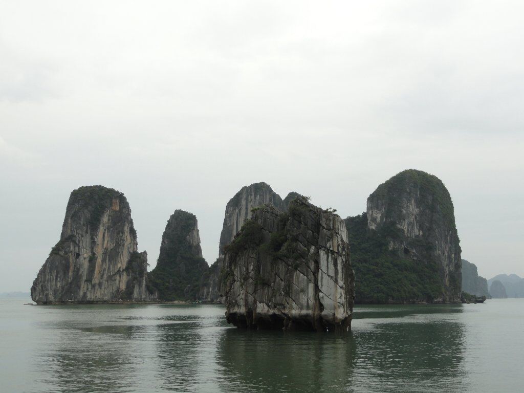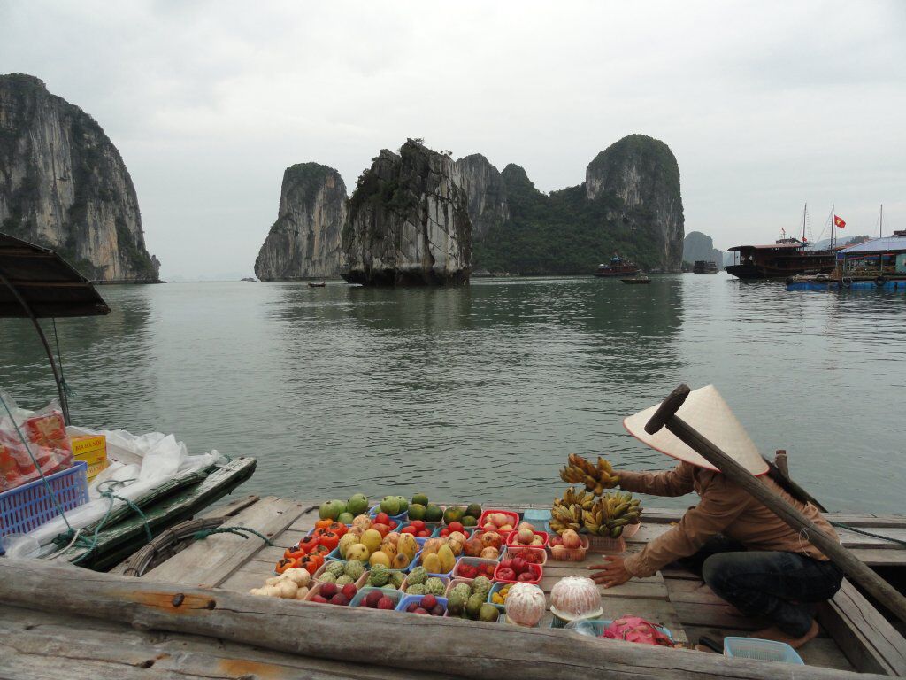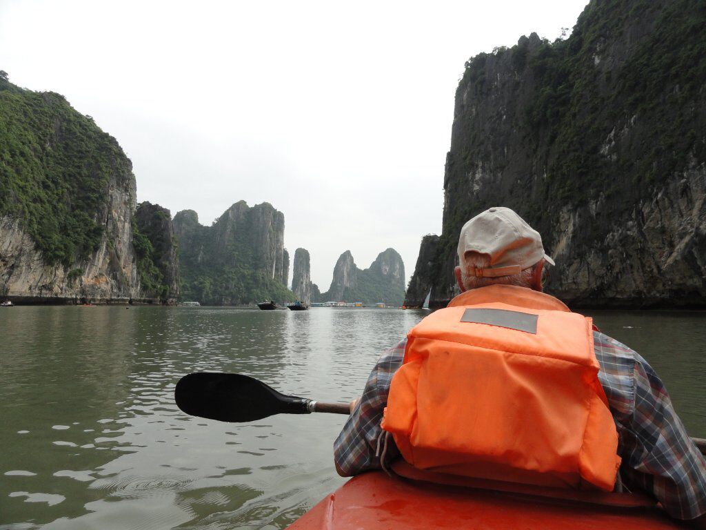 We hebben voor vandaag Halong Bay op het programma. En het regent niet. Dat op zich is al spectaculair. De hele regio heeft enorm te kampen met intense moesson regens. Maar vandaag niet. We kijken al heel lang uit naar Halong Bay en het wordt een beetje de kers op de taart van onze reis. Met een Kayak varen we een stukje tussen en door de rotsen. Heel plezant en indrukwekkend.