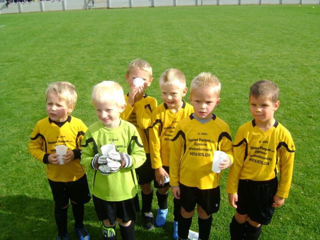 Met een sterk afgeslankte ploeg trokken we afgelopen zaterdag naar Kessel. Door ziekte waren er een aantal spelertjes niet beschikbaar en dus kwamen enkel de volgende 5 voetballertjes aan de aftrap: Seppe D.D., Sebbe, Berre, Kobe en Wixe. Het weer liet ons weer in de steek en tijdens de match regende het dan ook onophoudelijk. Onze jongens toonde zich zoals altijd van hun beste kant en konden via Wixe meteen op voorsprong komen. De tegenstander bood weinig weerstand waardoor Sebbe en Wixe zowat vrij spel kregen en met de hulp van Berre voor de 2 - 8 ruststand konden zorgen. Ook onze doelman van de eerste helft, Seppe D.D., had zijn werk dus goed gedaan. Snel trokken we naar de kleedkamer om even op te warmen want sommige van onze jongens zagen letterlijk en figuurlijk blauw van de kou. Tijdens de tweede helft ging Wixe tussen de doelpalen staan. Bij aanvang van deze tweede helft had hij nog wat problemen met zijn keepershandschoenen waardoor Kessel het eerste doelpunt van de tweede helft kon maken. Sebbe zorgde voor een echte hattrick door 3 maal op rij te scoren. Nog één keer kon Kessel de Vorselaarse doelwachter verschalken en Sebbe zorgde dan nog voor de 4 - 12 eindstand. Weer een prima resultaat voor onze jongens!