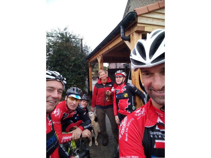 Eerste winterrit met start om 09.00u. En direct met 12 enthousiaste coureurs, wat een mooi zicht. Parcourbouwer Jan zond ons in tegenwind richting Overslag via Beervelde waar we een zodanig mooi rond punt zagen liggen in een zijstraatje dat we er naartoe reden. Voor de rest rustige, mooie wegen met een iets drukkere passage richting Dendermonde door een plaatselijke motorherfstrit. Met 77 km op de teller bolden we, na licht haantjesgedrag, binnen. Daar had Davy nog een verrassing in petto en werden wij de eerste, fiere eigenaars van ons oranje silliconenbandje. Mooi en te koop voor slechts €2,-