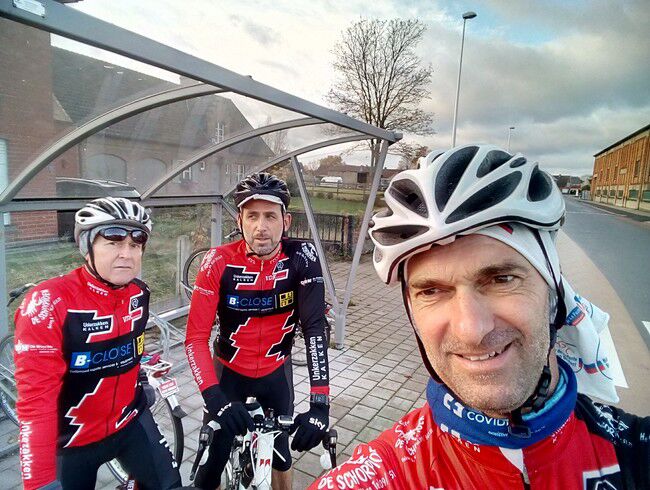 Deze rit begon uitzonderlijk vroeg in deze kersttijd, om 8.30u. Maar niet om te fietsen, wel om de inwendige mens te versterken met een stevig ontbijt t.v.v. team ctien die zich inzetten voor de 1000km kom op tegen kanker. Het was heel lekker en gevarieerd, getuige de aanwezigen Davy, Jan, Hendrik, Johan, Geert en Filip. Ook verschillende dames waren van de partij. Om 9.30u. begon dan het sportieve luik van deze voormiddag. Er sloten nog 3 andere renners aan( Bart, Gerrit en Jules) en onder een dreigende hemel en een sterke westenwind (beaufort 5) vertrokken we voor een ritje 'rond de kerktoren'. Ondergetekende kon tijdens de tocht rekenen op zijn ploegmakkers (echte BFF'ers) want zijn drinkbus was thuis gebleven. Thx daarvoor. In Wetteren fietsten we de scheldedijk op richting Schoonaarde met wind in de rug. Daar aangekomen kozen we richting Zele. Eenmaal in Zele trokken de hemelsluizen volledig open en werden we met een serieuze tegenwind niet gespaard. Als echte flandriens zetten we onze tocht verder naar Heikant en Overmere. Het bleef oude wijven regenen en alsof dat nog niet genoeg was, sloeg het noodlot toe voor capt.Phil: Lekke band op 4 km van de eindstreep. Dankzij Bontempi's lucht en Barts bommeken reden we verder tot op de 'sante' tot bij moet. Ondertussen was Gerrit zich vestimentair gaan wisselen zodat we een beetje verbrokkeld aankwamen met een afstand van 49 kilometer. Jules vond dit onvoldoende en fietste (zwom) verder tot hij afklopte op 88.5km. Chapeau!!!