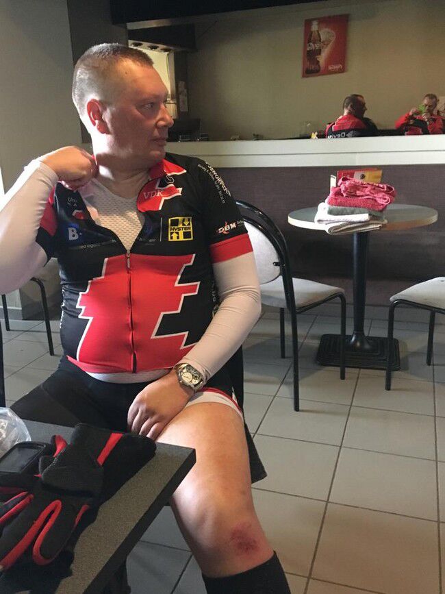 De B-ploeg fietste richting Stekene en bewees waarom het op te letten is bij regenweer. De onfortuinlijke Peter R. kwam onzacht in aanraking met het asfalt ter hoogtre van Zeveneken. Gevolg: geschaafde knie en maandag naar spoed. Het wordt vier weken nagelbijten en rusten. Wij wensen hem een heel spoedig herstel.