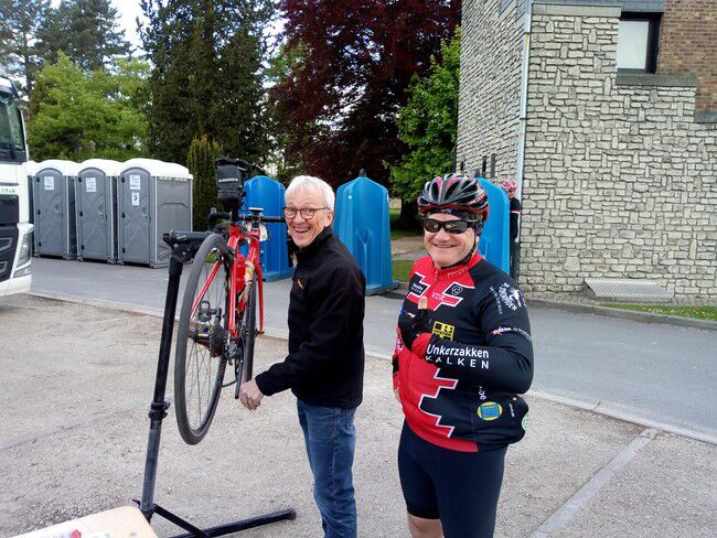 Na een heel vlotte inschrijving vatten we onze tocht aan. In het begin fietsten we langs veel gekende (KOTK-rit) wegen en bleven we mooi tesamen. Eenmaal in de heuvelzone kwam het zwaardere werk voor de wielen en na enkele beklimmingen besloten we om ons op te delen in 2 groepen. Verschillende mooie, onbekende beklimmingen en fantastische vergezichten maakten verder deel uit van het parcour en na 50km was de eerste en enigste bevoorrading. Sommigen onder ons maken hier gebruik van de technische dienst om hun fiets eens up te daten. (zie foto) De twee groepen smeltten terug samen en begonnen onmiddellijk aan de beklimming van de gekendste helling, de Berendries. Iedereen nam ook deze bult zonder problemen en de laatste 30km legden we in groep af wat een heel aangenaam gevoel gaf van 'samen uit, samen thuis'. Na een Kwaremontje in Wetteren vertrokken we naar Kalken maar aangezien Moet gesloten was, kwamen we terecht bij moet 2.0, 'den Bouw' in de Zomerstraat. Het werd een heel leuk alternatief maar vertrokken snel huiswaarts om onze ega's voor de rest van de dag te soigneren.