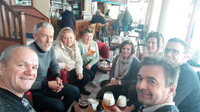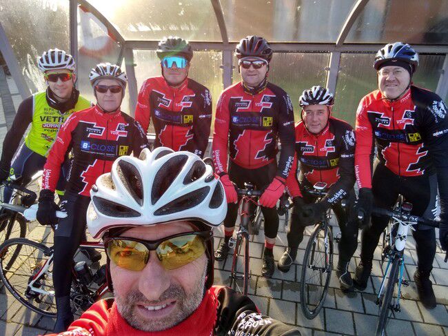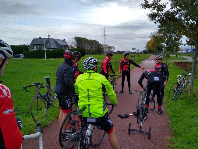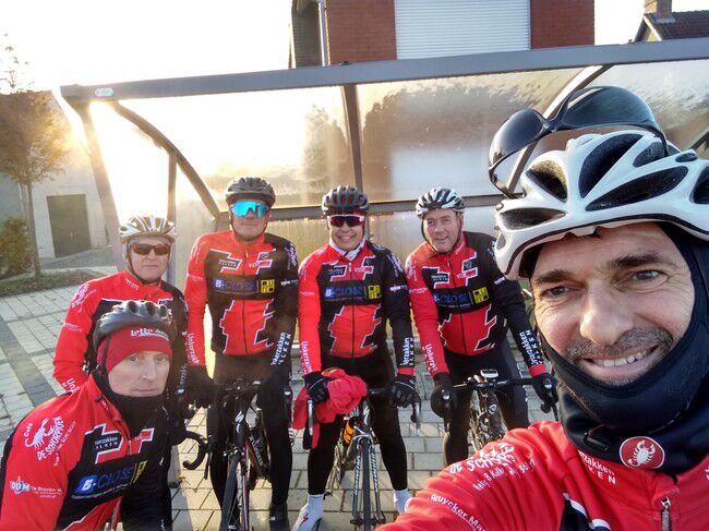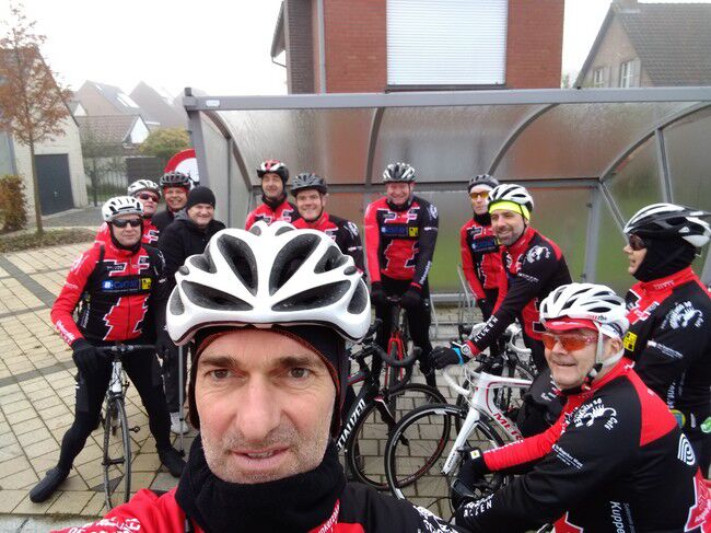 De vvorlaatste rit van 2019 bracht 8 dappere jongemannen op de fiets: Luc, Bertrand, Peter R., Hendrik, Gerrit, Kris, Johan en Filip. Stipt 9.15u. vertrok onze fietskaravaan richting het Westen voor de 'Admiraal'route. We fietsten de volgende gemeenten door: Kalken, Laarne, Destelbergen, Heusden, Melle, Lemberge, Moortsele, Balegem, St.L.Houtem, Bavegem, Oordegem, Massemen, Wetteren en opnieuw Kalken. Goed voor een tocht van 59km, 258 hoogtremeters en een gemiddelde van 26.5km/u. De tocht verliep grotendeels langs autoluwe, modderige betonbaantjes waar het regelmatig opletten was in de bochten. Bertrand vond na een 45km dat het tijd was voor een rustpauze en zette zijn band plat. Eigen schuld, dikke bult dus kon hij het alleen oplossen...maar Luc springt altijd bij in nood. Bijna thuis werden we dan toch opgeschrikt door een valpartij van Peter. Met de schrik en wat blik(fiets)schade kwam hij er goed vanaf en kon hij toch zijn tocht verder zetten tot bij Moet. Daar wachtten de handdoeken opnieuw op ons EN onze voorzitter Jan. Zijn herstel gaat met rasse schreden vooruit zodanig dat we hem misschien zondag kunnen verwelkomen aan het buskot...met fiets. Knap!!