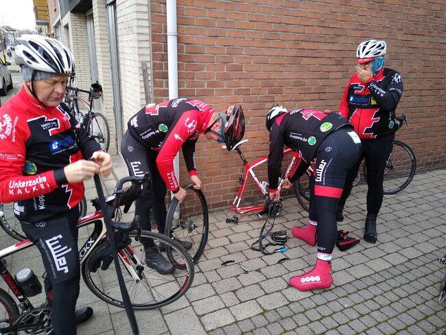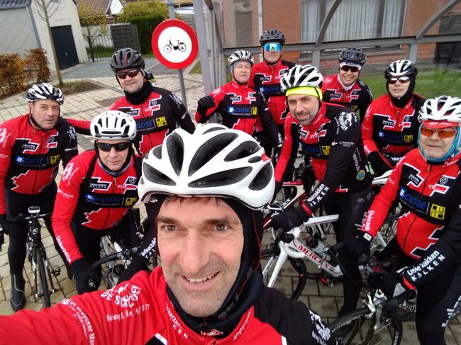 De vvorlaatste rit van 2019 bracht 8 dappere jongemannen op de fiets: Luc, Bertrand, Peter R., Hendrik, Gerrit, Kris, Johan en Filip. Stipt 9.15u. vertrok onze fietskaravaan richting het Westen voor de 'Admiraal'route. We fietsten de volgende gemeenten door: Kalken, Laarne, Destelbergen, Heusden, Melle, Lemberge, Moortsele, Balegem, St.L.Houtem, Bavegem, Oordegem, Massemen, Wetteren en opnieuw Kalken. Goed voor een tocht van 59km, 258 hoogtremeters en een gemiddelde van 26.5km/u. De tocht verliep grotendeels langs autoluwe, modderige betonbaantjes waar het regelmatig opletten was in de bochten. Bertrand vond na een 45km dat het tijd was voor een rustpauze en zette zijn band plat. Eigen schuld, dikke bult dus kon hij het alleen oplossen...maar Luc springt altijd bij in nood. Bijna thuis werden we dan toch opgeschrikt door een valpartij van Peter. Met de schrik en wat blik(fiets)schade kwam hij er goed vanaf en kon hij toch zijn tocht verder zetten tot bij Moet. Daar wachtten de handdoeken opnieuw op ons EN onze voorzitter Jan. Zijn herstel gaat met rasse schreden vooruit zodanig dat we hem misschien zondag kunnen verwelkomen aan het buskot...met fiets. Knap!!