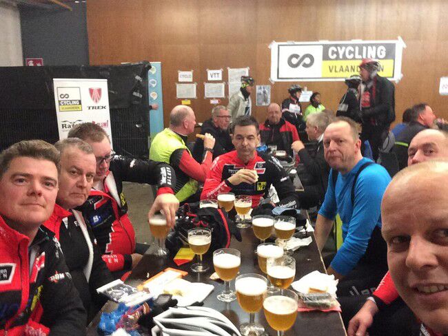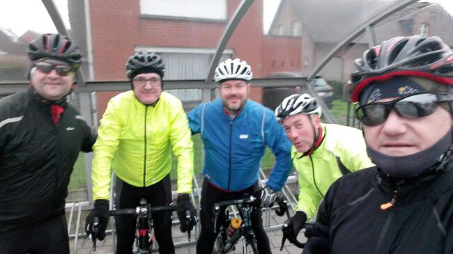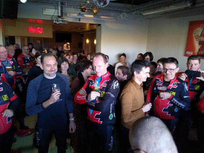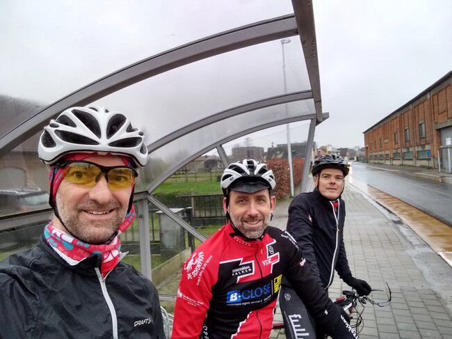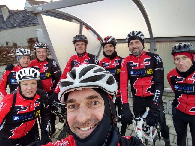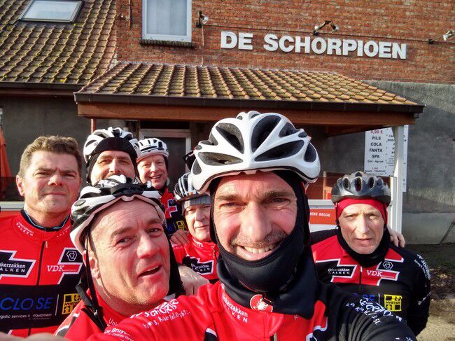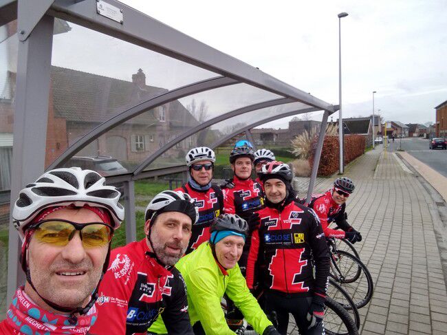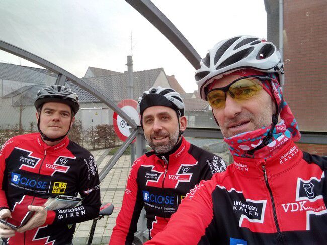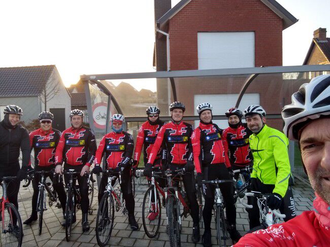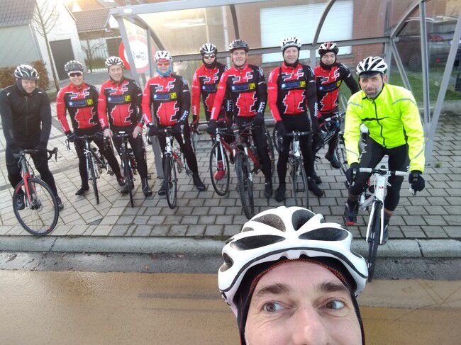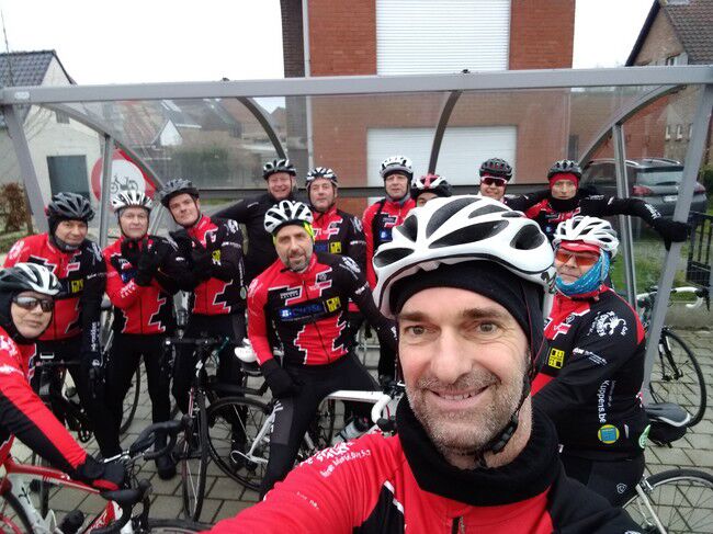 De vvorlaatste rit van 2019 bracht 8 dappere jongemannen op de fiets: Luc, Bertrand, Peter R., Hendrik, Gerrit, Kris, Johan en Filip. Stipt 9.15u. vertrok onze fietskaravaan richting het Westen voor de 'Admiraal'route. We fietsten de volgende gemeenten door: Kalken, Laarne, Destelbergen, Heusden, Melle, Lemberge, Moortsele, Balegem, St.L.Houtem, Bavegem, Oordegem, Massemen, Wetteren en opnieuw Kalken. Goed voor een tocht van 59km, 258 hoogtremeters en een gemiddelde van 26.5km/u. De tocht verliep grotendeels langs autoluwe, modderige betonbaantjes waar het regelmatig opletten was in de bochten. Bertrand vond na een 45km dat het tijd was voor een rustpauze en zette zijn band plat. Eigen schuld, dikke bult dus kon hij het alleen oplossen...maar Luc springt altijd bij in nood. Bijna thuis werden we dan toch opgeschrikt door een valpartij van Peter. Met de schrik en wat blik(fiets)schade kwam hij er goed vanaf en kon hij toch zijn tocht verder zetten tot bij Moet. Daar wachtten de handdoeken opnieuw op ons EN onze voorzitter Jan. Zijn herstel gaat met rasse schreden vooruit zodanig dat we hem misschien zondag kunnen verwelkomen aan het buskot...met fiets. Knap!!