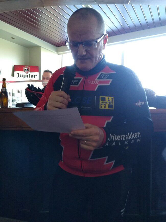 Deze rit stond in het teken van onze nieuwjaarsreceptie. Het was vroeg verzamelen geblazen voor de 17 unkerzakbikers: om 8.45u. En bij die 17 een nieuw gezicht: Steffen Van De Velde, zoon van Luca Del Campo. Welkom en hopelijk zien we hem veel opduiken. Er was een rit in Overmere waar we 50km gingen fietsen. Na de inschrijving trokken we op pad met de bedoeling om de pijltjes van de inrichters te volgen. Maar al snel beslisten we om dat niet te doen... Veel te glad op de mooie maar gevaarlijke wegen. We namen dan maar, tegen onze natuur in, allemaal hoofdbanen en het was een voordeel dat we met 17 renners waren. Zo konden we het fietspad vermijden en begaven we ons op de baan, wat sommige autobestuurders toch frustreert. Jammer. Zonder ongelukken arriveerden we bij Moet waar ons, zie de foto's, een gezellige receptie stond op te wachten met dank aan de hapjes van Peggy. Het was aangenaam vertoeven in de herberg met de speech van onze voorzitter Bontempi en het statistiekenoverzicht van capt.Phil. De eindlaureaat van 2019 van de meeste aanwezigheden ging voor de derde keer op rij naar Luca Del Campo (Luc Van De Velde) met maar liefst 46 zondagen. Proficiat!! De speech van onze voorzitter kan je hieronder lezen.