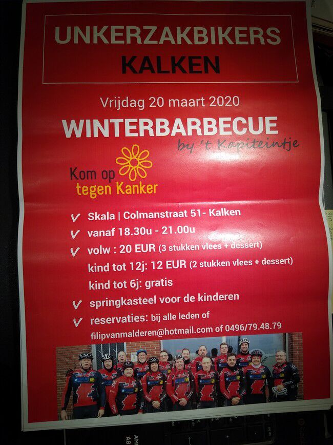 Woensdag 19/02 zaten de unkerzakbikers nog eens samen om onze nakende activiteiten te finetunen. Alles staat in het teken van die vreselijke ziekte, kanker. Wij hebben ons geëngageerd om met drie teams mee te fietsen aan de 1000km KOTK dat doorgaat van 21-24 mei. Daarvoor moeten wij 16.500,- inzamelen. Steun ons om dit bedrag bijeen te krijgen door je aanwezigheid bij één van onze twee activiteiten. (zie hieronder). Kaarten voor ons eetfestijn zijn te bekomen bij alle leden (Je moet wel op voorhand een kaart in je bezit hebben) Voor de wandel- en fietstocht is op voorhand in te schrijven niet nodig. Wij hopen jullie te mogen verwelkomen op één van deze organisaties. Je zal het je zeker niet beklagen. Tot dan!!!!