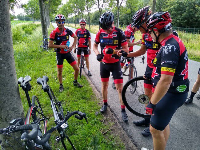 En de pech zat in het begin van deze rit. Eerst moest capt.Phil voet aan de grond zetten om zijn remmen wat meer open te zetten, dan vond Bjorn het nodig om zijn drinkbus eens op de grond te keilen en nog voor dat we 10km hadden gebold, kreeg Geert een klapband. Getuige de foto.