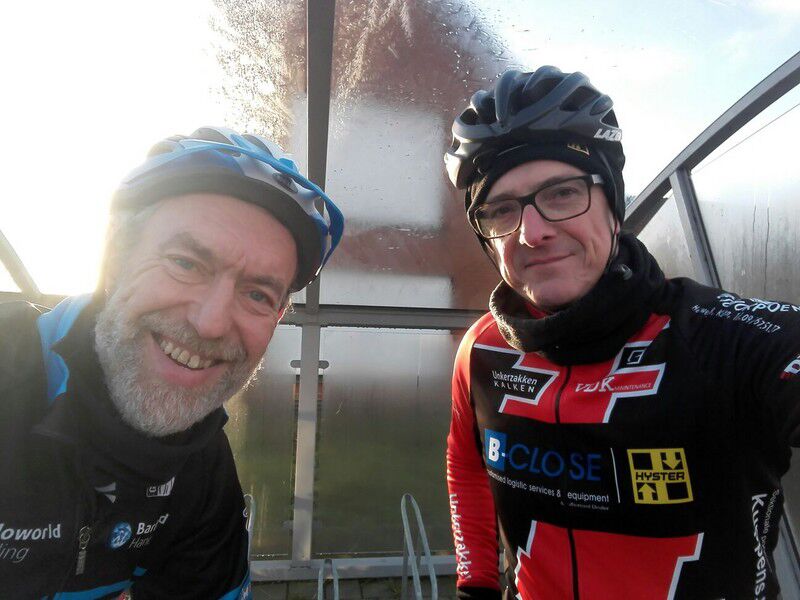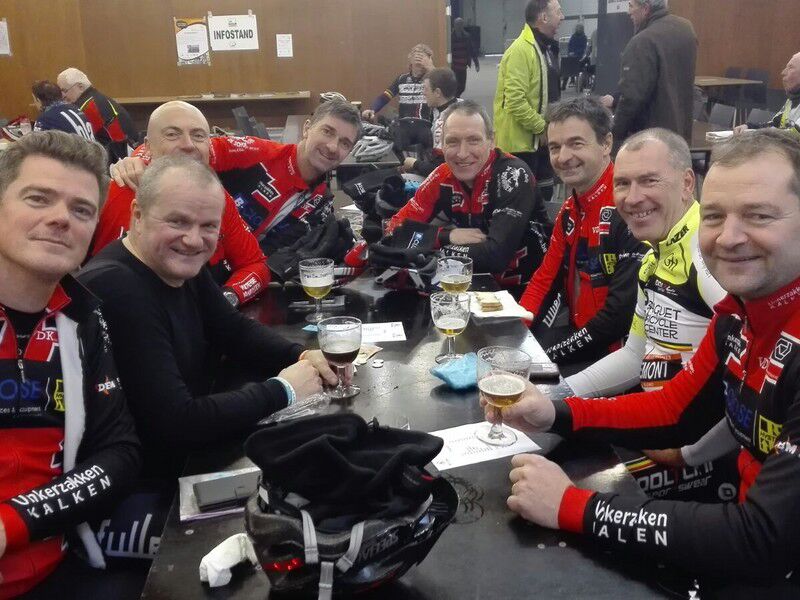 We vallen in herhaling maar zondag was het alweer historisch. 14 dagen geleden in een sneeuwlandschap, vorige week IN de sneeuw en zondag hadden de weergoden beslist om de wegen eens te veranderen in een ijspiste, kwestie van voldoende te variëren en in de kerstsfeer te blijven. We namen deel aan een georganiseerde tocht van onze bevriende club de Calcine, ook uit Kalken. Tijdens de inschrijving beslisten we al snel om enkel op de hoofdwegen te fietsen en niet de bewegwijzerde tocht te volgen. Dit viel mee tot we in Zele kwamen waar het ijs nog dikker lag als in Kalken en de weg een echte ijspiste was. We keerden onze voorwielen terug richting Kalken en besloten in Overmere om nog een klein ommetje naar Berlare te fietsen om daar de ruime bevoorrading mee te nemen. Ook daar waren de wegen nog glijwegen zodat we zonder te moeten nadenken naar de Scala fietsten. Na 35 km zat ons winteruitstapje erop en konden we genieten van het lekkere gerstenat Blonde Ename. Ook Kurt en Gerrit beslisten te schaatsen maar na 5km bergden zij hun stalen ros op in hun garage. Geen valpartijen. Dat was het belangrijkste want de spoeddiensten waren overbezet, mede door een Kalkenaar. Spoedig herstel André.