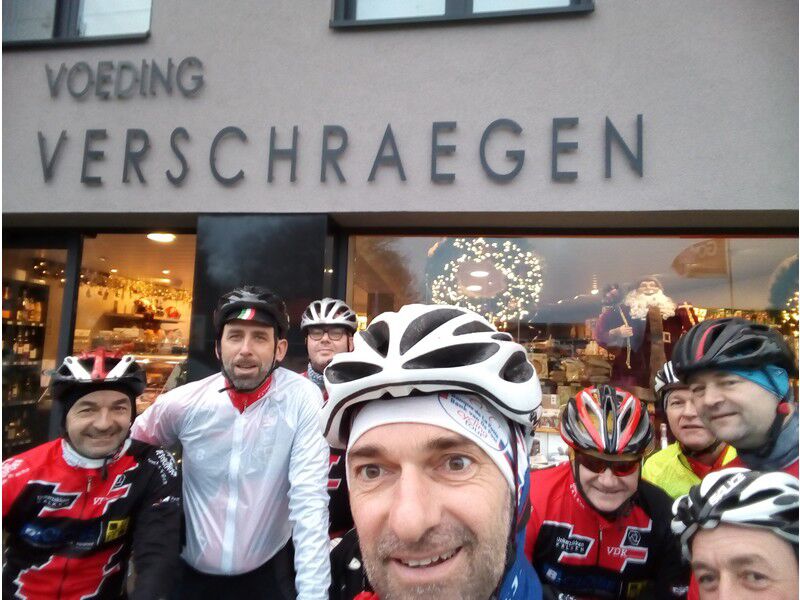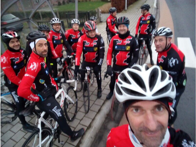Een paar kilometer verder was er dan een verrassing want opeens veranderde het betonwegdek in een veldweg waar het heel moeilijk rijden was met een racefiets. Daar vonden we dus een werkpuntje voor onze parcourbouwer. Vanaf dan verliep opnieuw alles vlekkeloos en langs gekende wegen keerden we via Melle terug huiswaarts. Onze vaste thuisbasis De Schorpioen was gesloten zodat we even halt hielden in den aprés sport op de Kruisen. Bedankt voor de mooie opkomst (11 renners) en tot volgende zondag voor onze laatste rit van het jaar.