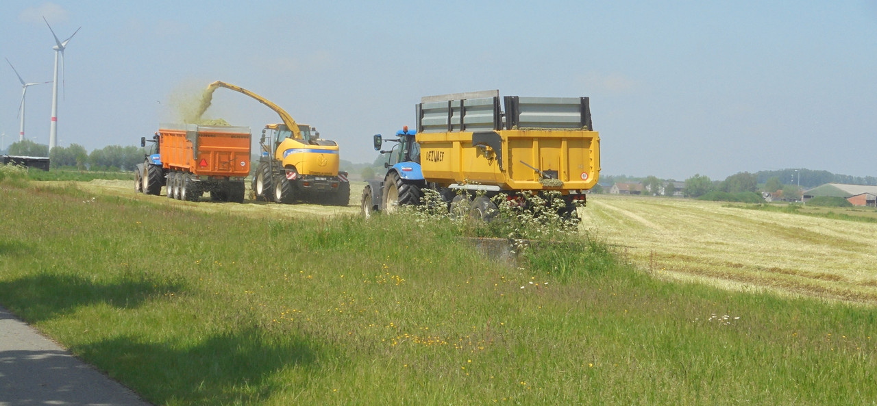 KAPRIJKE - Zondag of niet, vandaag was er veel verkeer van landbouwmachines en tractors op de wegen en velden. Landbouwers en loonwerkers waren druk in de weer voor het binnenhalen van het afgereden gras (onder). En net als gisteren waren er terug veel fietsers op weg naar nergens, gewoon voor de ontspanning een rondje rijden in de streek. Op het Plein waren uiteraard de terrassen druk bezet en op het grasgedeelte waren gezellige bubbels ingericht (boven).