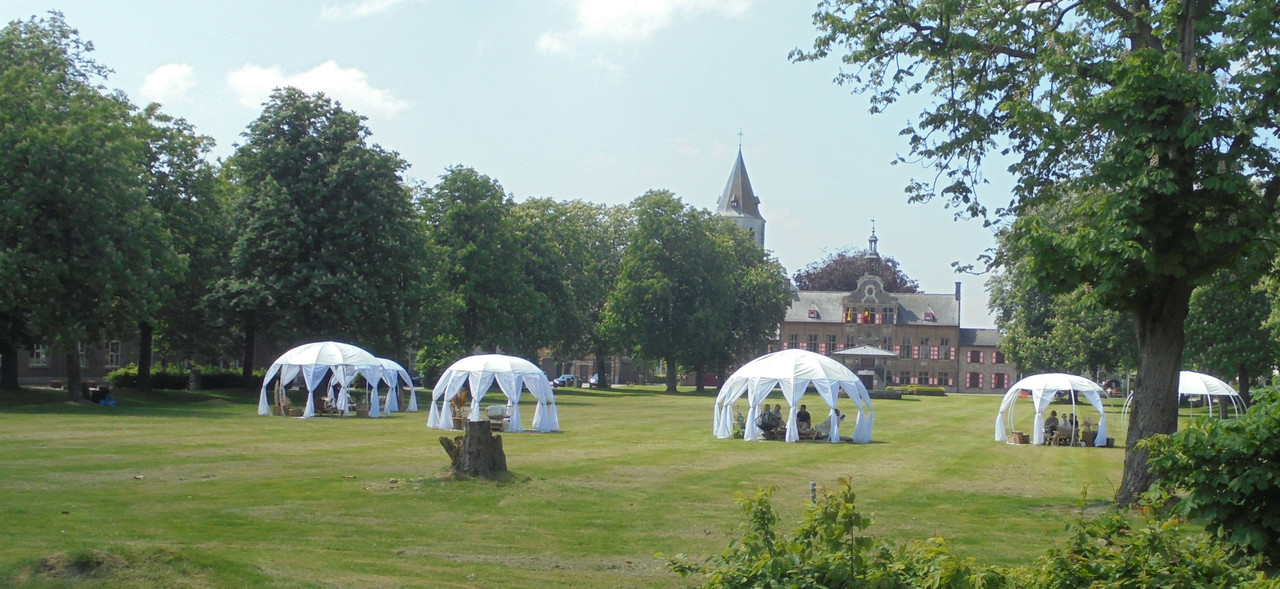 Onder: een stal in opbouw, het steekt blijkbaar op geen meter.