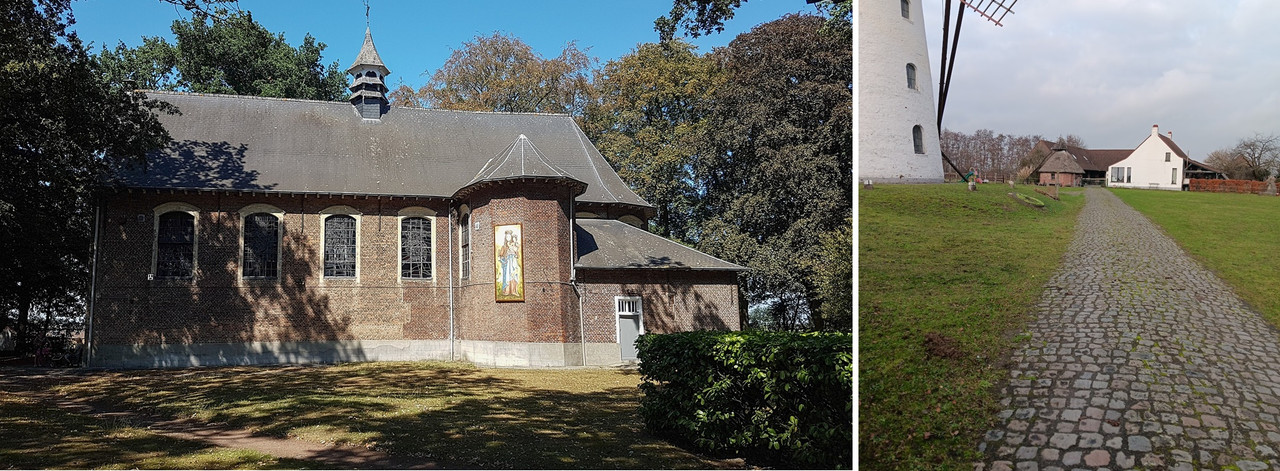 ERTVELDE (Evergem) - Vandaag waren op uitnodiging op stap in Ertvelde, het dorp van de Voice of Europe. De wandeling liep richting de Onze-Lieve-Vrouw van Stoepekapel, opgericht in 1422 na een wonderbare genezing. De naam liet vermoeden dat dit een kapel was, maar bij de eerste kennismaking ziet men dat dit eerder een kleine parochiekerk dan een kapel is. Op de foto links (Wikipedia) de genoemde kapel en op de foto rechts een glimp van de stenen molen met in het midden de rosmolen.